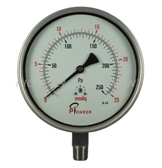 | 膜盒压力表主要是用于量测气体介质之微小压力因其压力敏感元件是由两块波浪型的金属膜片组成的弹性膜盒故而称之为膜盒压力表。它与一般压力表不同之处在于它能量测较为微小的压力故又称微压表。微压表通常用水柱高度为参照单位故台湾称之为水柱表或微压计。膜盒压力表也通常用于燃气设备及燃气管路上所以也有人称之为燃气微压表。 膜盒压力表主要是依靠膜盒作为感应元件对压力进行测量。膜盒分为2种一种是由两个具有弹性的金属膜片焊接而成另一种为单片膜片与基底座焊接(称单片膜盒)。膜盒的外面焊有拔杆并接到齿轮机芯上当测量介质的压力作用在膜盒腔内时由此产生的膜盒的弹性变形位移位移量与介质所施加压力通常呈线性关系压力敏感元件的变形幅度取决于测量介质压强的大小压力使膜盒产生变形位移通过膜盒上焊接的拔杆传递到仪表的机芯位移量大小通过齿轮及连杆放大传递到终端指示装置(指针及刻度盘)显示压力数值。 膜盒压力表一般用来测量气体的微小压力量程和量测的精度通常取决于表头大小(膜盒的大小)和压力敏感元件的材质。PIONEER微压表通常都有过压保护装置能在一定程度上防止压力过大造成的仪表损坏但是其作用是有限的不能依赖于该功能在选择量程时一定要注意选用正确的压力范围以免压造成不必要的损失。当几个膜盒敏感元件叠放在一起后会产生较大的传递力来量测极微小的压力膜盒压力表的测量范围在0~2.5mbar到0~600mbar量测的精度在0.25~5级。 因为各地区海拔高度不同及使用仪表的工作环境温度不同因其压力指示极其敏感故而会造成指针不在零位PIONEER微压表都设有调零装置能适于各种工作环境。 膜盒压力表的测压膜盒通常为铜合金如磷铜铍铜用于特殊工作环境或用于特殊压力介质时通常选用不锈钢材料或其它合金金属全不锈钢膜盒压力表通常会使用SUS304不锈钢或SUS316及SUS316L不锈钢。 |