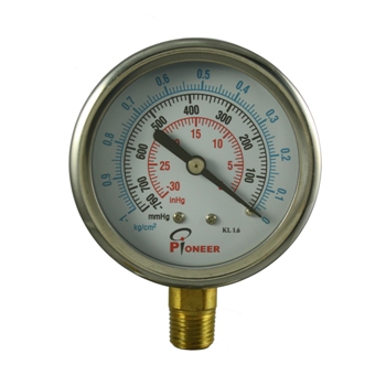 | 真空压力表由导压系统<包括接头,弹簧管(又称登管或波登管)阻尼镙钉>,齿轮传动机构,示数装置(指针与标度盘)和外壳部分(包括表壳,圈罩,表窗)组成,通过弹簧管的线性弹性变形的位移,传递压力到仪表的示数装置,从而达到量测的目的.真空压力是指低于大气压的负压力,真空压力表指示的压力值的值被称为真空度,真空压力表的量程较小,大仅为-0.1~0Mpa(Max). 选型参考: |